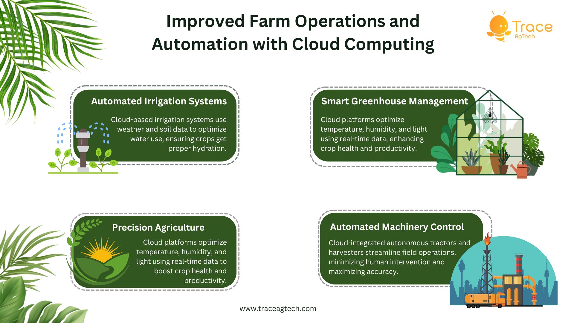 Cloud computing enhances farm operations by integrating automated systems that streamline processes such as irrigation, fertilization, pest control, and harvesting. Cloud-based platforms allow farmers to control and monitor these operations remotely, improving efficiency and reducing manual labor.