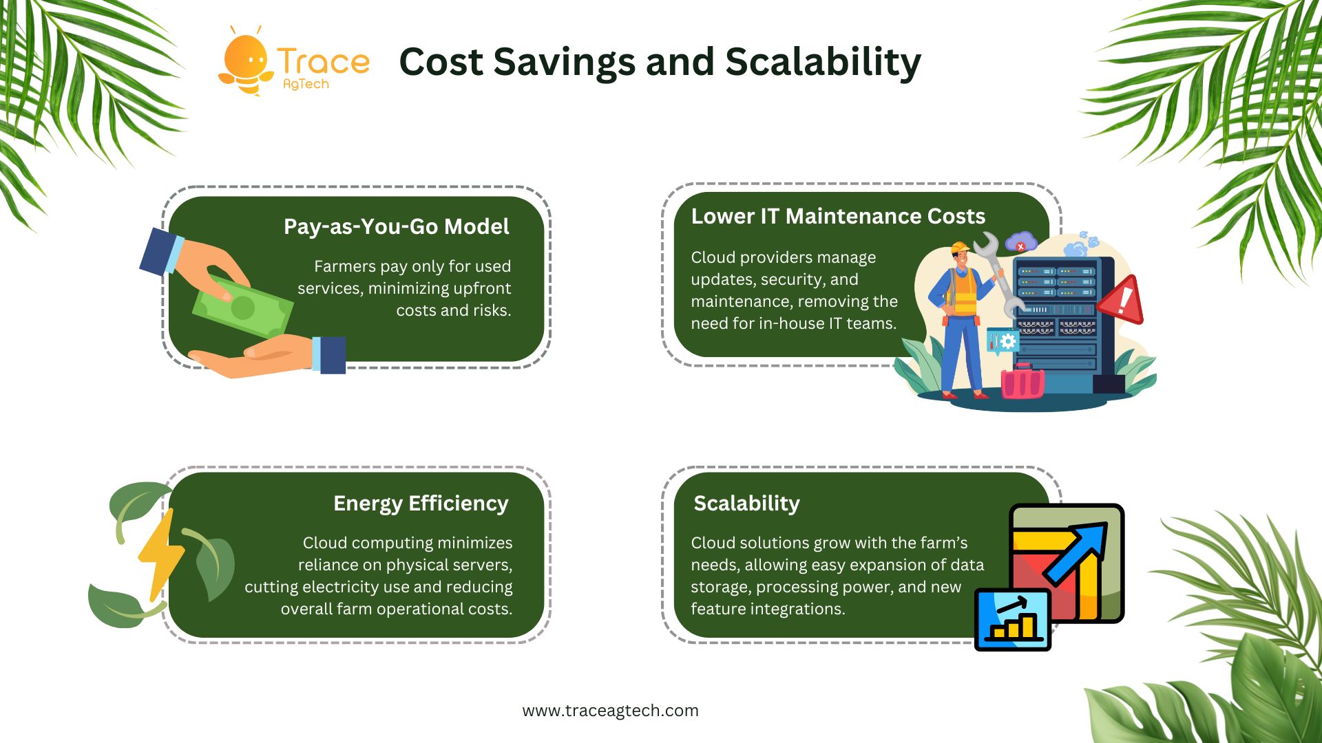 Cloud computing significantly reduces the cost of implementing and maintaining farm management systems. Unlike traditional IT infrastructure, which requires substantial investments in hardware, software, and IT personnel, cloud-based solutions offer cost-effective alternatives with scalable features.
