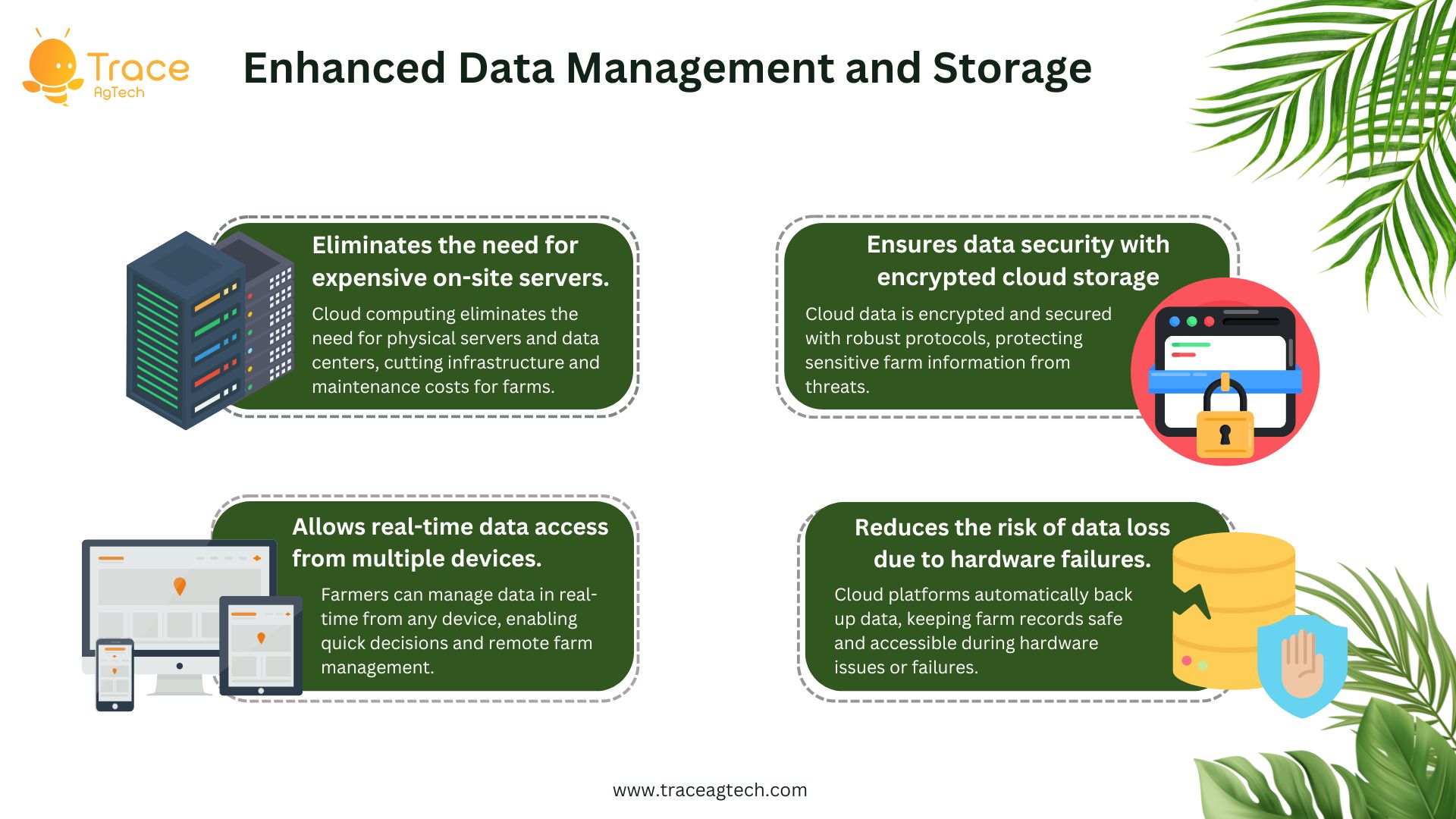By leveraging cloud-based data management, farmers can make informed decisions based on accurate and up-to-date information, leading to increased efficiency and productivity.